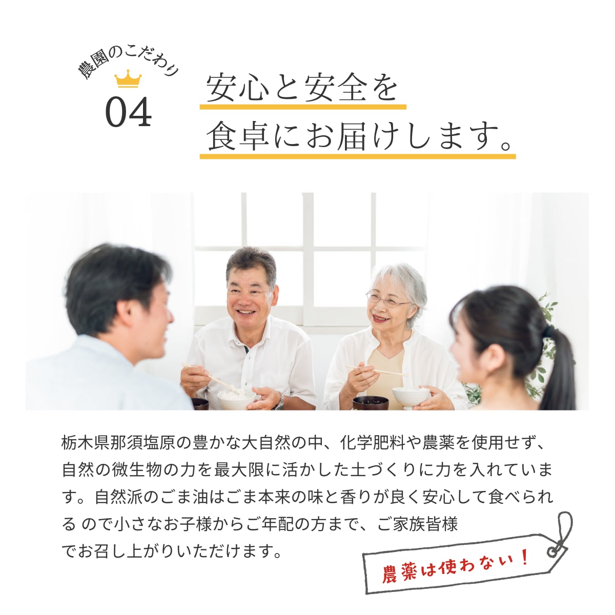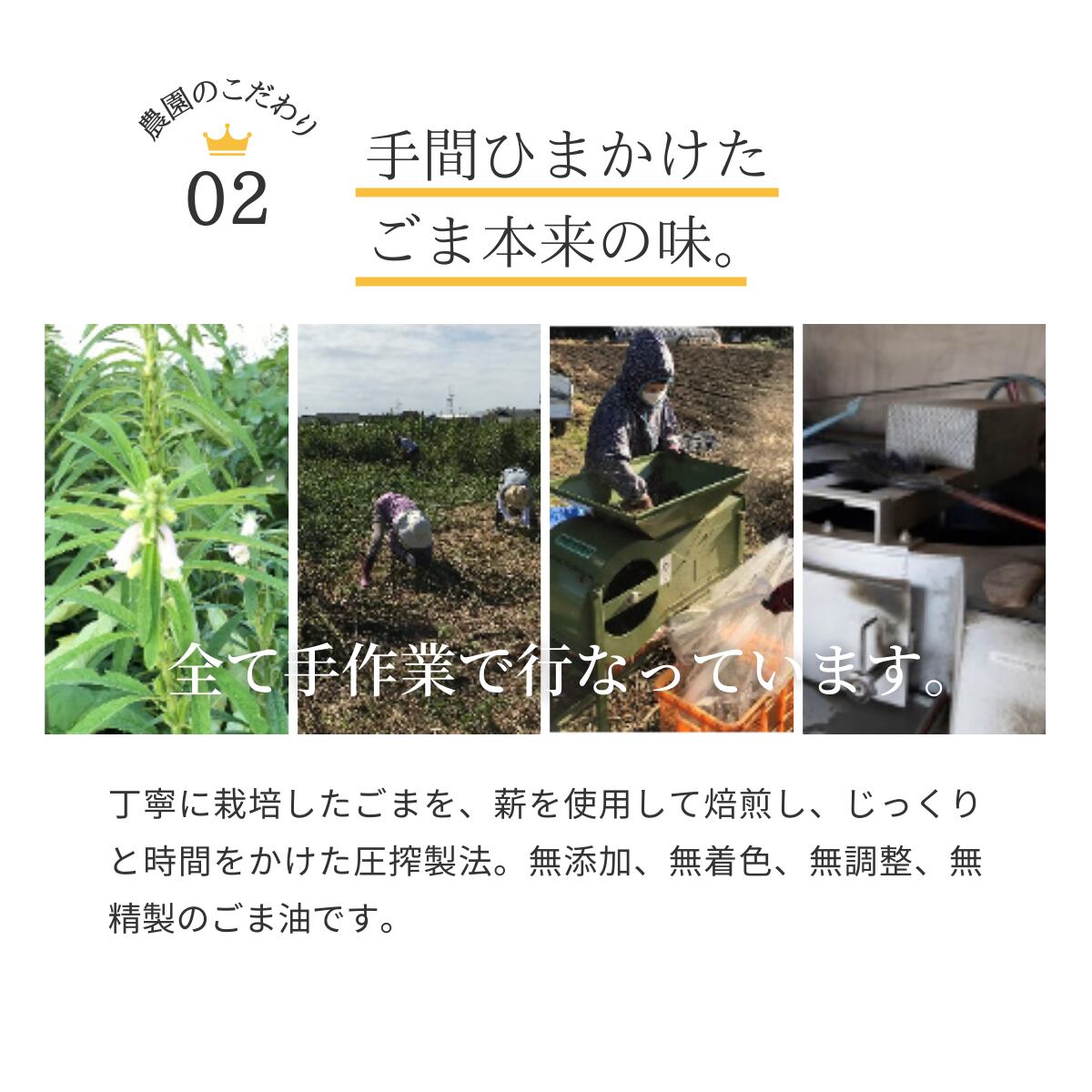 こちらのごま油は、栽培期間中、農薬・除草剤・化学肥料を使用せず栽培した黒ゴマを薪や練炭を用いて焙煎した後、じっくりと時間をかけて圧搾する製法で作られた無添加・無着色・無調整・無精製のごま油になります。