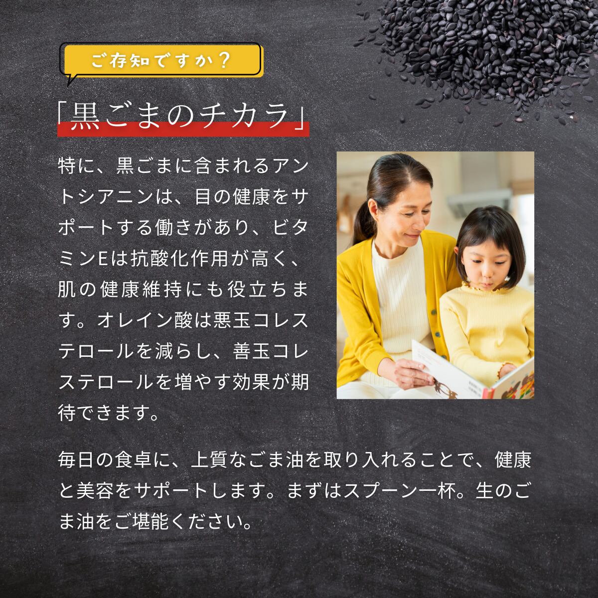 一般的なごま油は白ごまから作られますが黒ごまから作るごま油は黒ごま独特の風味があり、濃厚な香りと味わいがあります。アントシアニンは、ポリフェノールの一種で目の健康に効果があると言わる栄養素。白ごまや金ごまにはない、黒ごまならではの栄養素です。