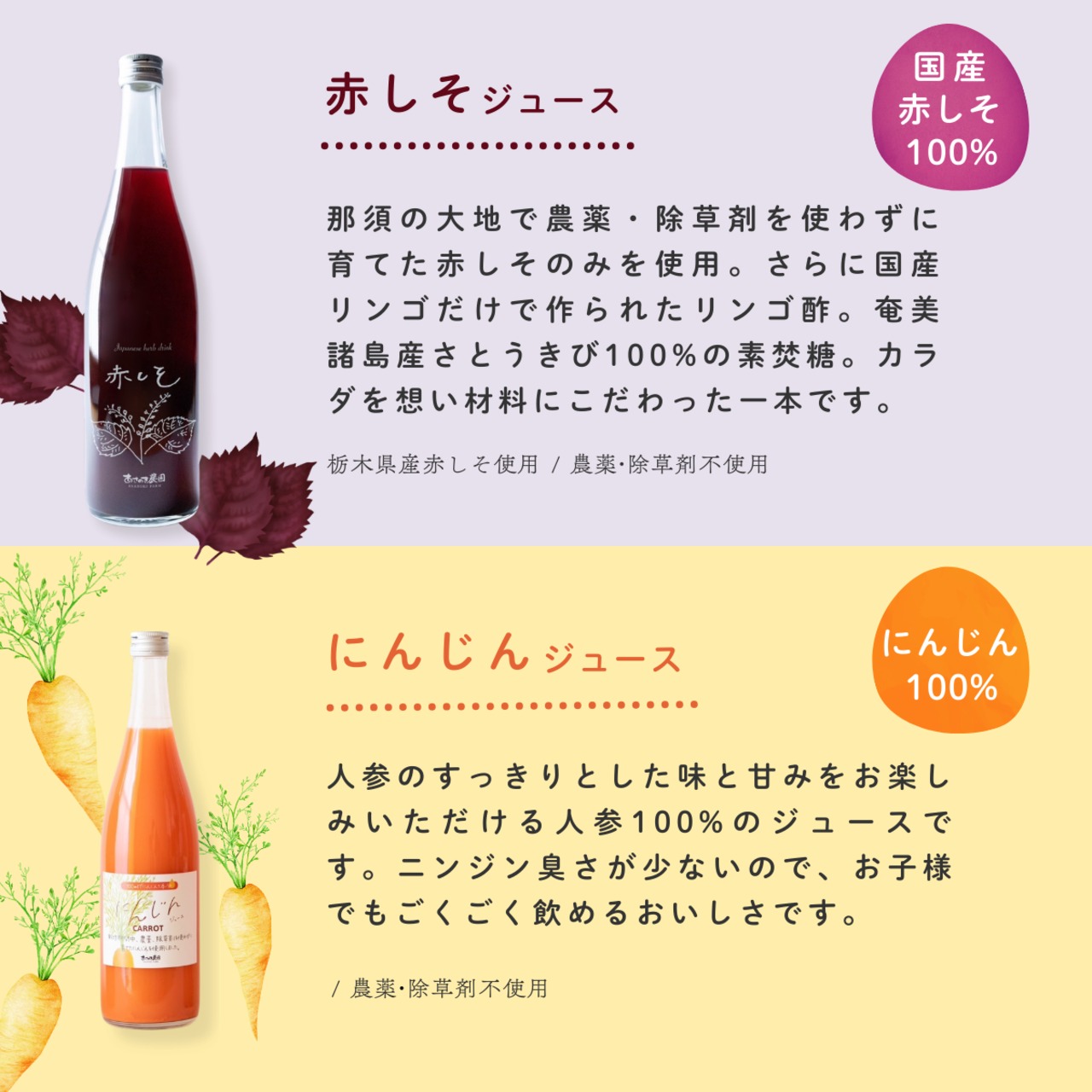 飲み比べ 選べる2点セット 農薬|除草剤不使用 720ml×2 子供に大好評 国産しそ100% にんじんジュース りんご果汁