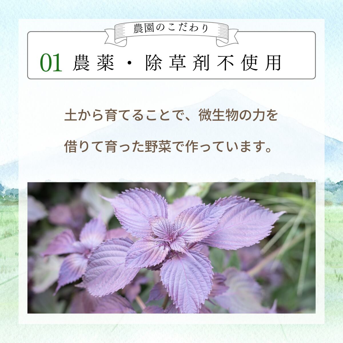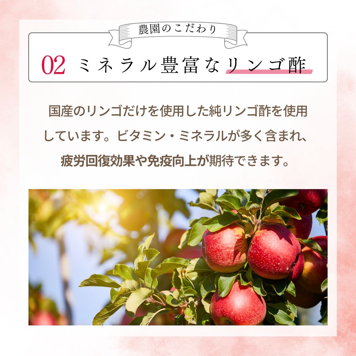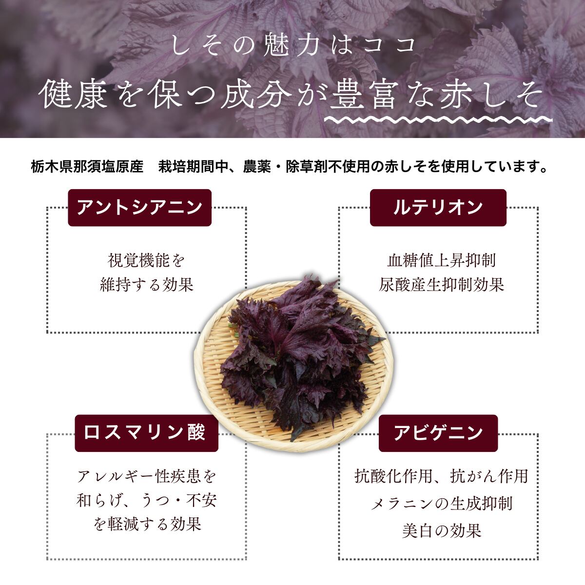 那須の大地で、農薬除草剤を使わず大切に育てた赤しそ。ミネラルたっぷりの国産リンゴだけで作られたリンゴ酢。微量ミネラルが効いた奄美諸島産さとうきび100%の素焚糖。